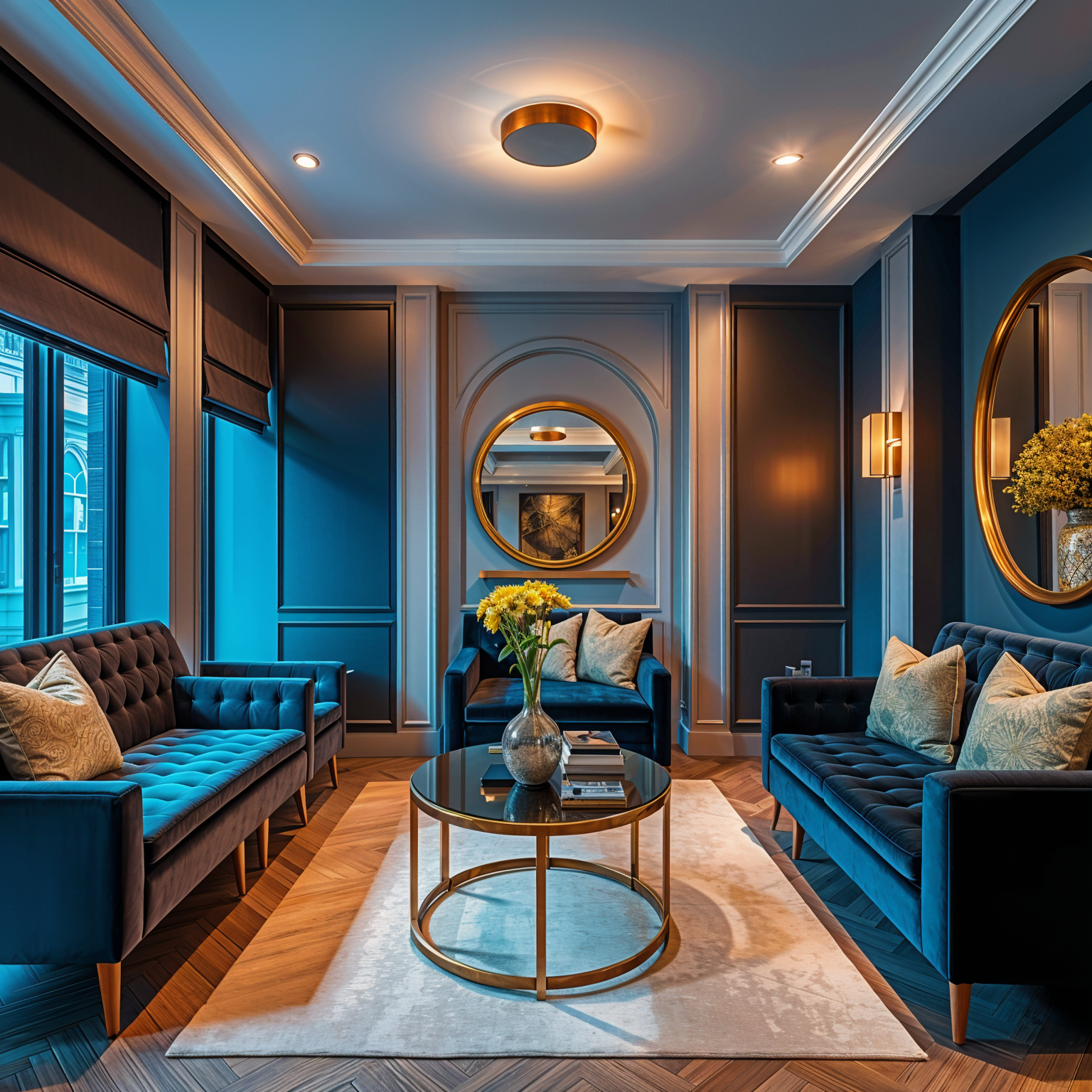 A space that exudes sophistication with velvet furnishings, gold accents, and ambient lighting for a touch of glam